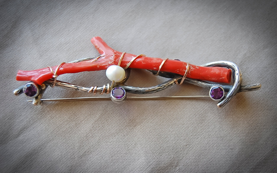 Брошь серебряная с элементами золота с кораллом, жемчугом и аметистами.