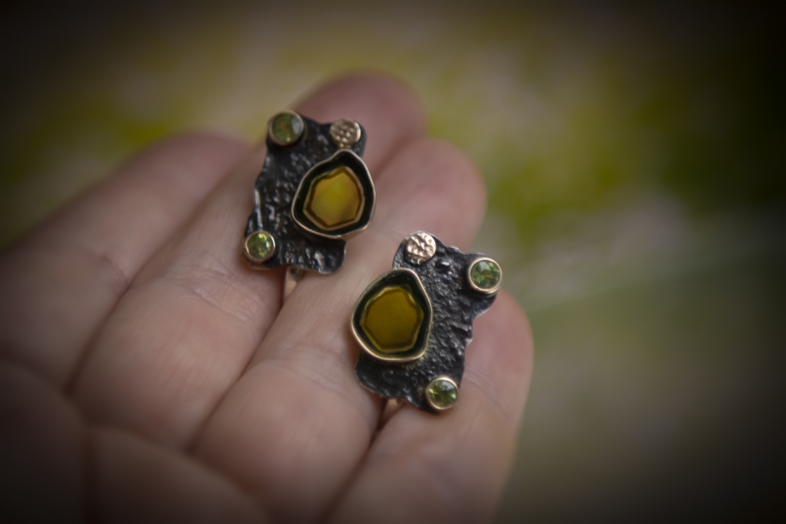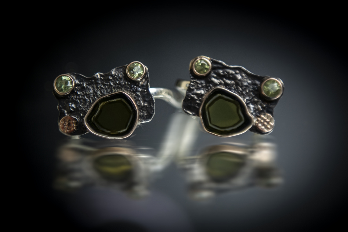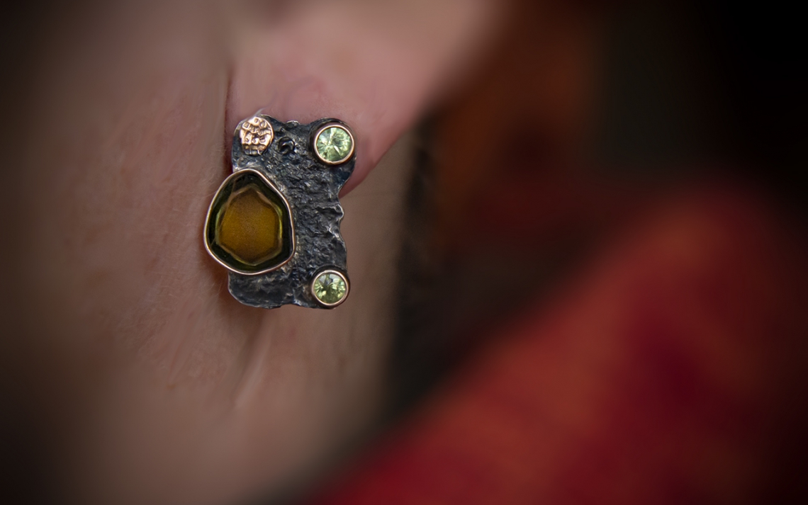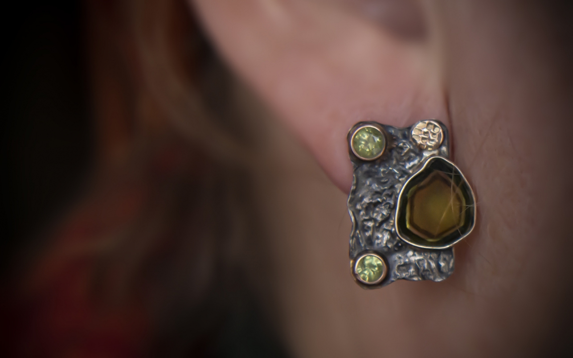 Серебряные серьги с кристаллом турмалина с демантоидами (зеленый гранат). Турмалин является одним из самых универсальных драгоценных камней в мире минералов, поскольку он входит в число редких драгоценных камней, которые бывают всех цветов радуги.